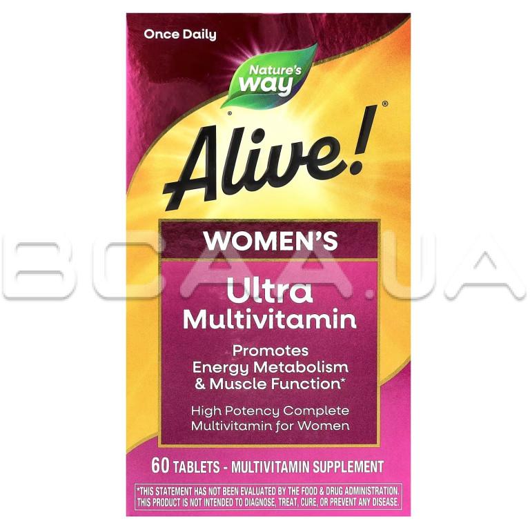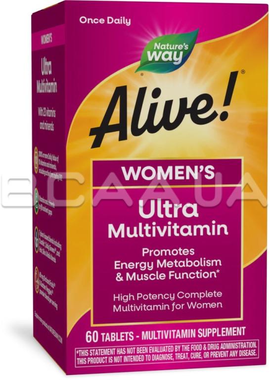- Nature's Way, Alive! Women's Ultra Multivitamin - это мультивитаминный комплекс, разработанный для удовлетворения ежедневных потребностей в питании активных женщин, который поддерживает ваш организм с помощью высокоэффективной смеси основных витаминов, минералов и пищевых питательных веществ.