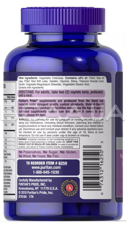 Другие ингредиенты: растительная целлюлоза. Содержит <2%: FD & C Blue # 2 Lake, FD & C Red # 40 Lake, желатин, глицин, диоксид кремния, краситель диоксид титана, ванилин, растительный стеарат магния, растительная стеариновая кислота. Содержит молочные ингредиенты.
