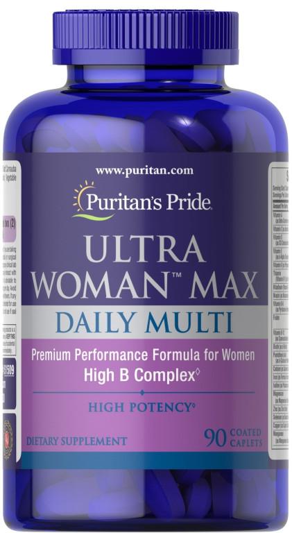 - Puritan’s Pride Ultra Woman™ Max Daily Multivitamin — это расширенный мультивитаминный комплекс для женщин в форме покрытых каплет. Формула содержит витамины, минералы, антиоксидантные и растительные комплексы, а также дополнительные активные компоненты.