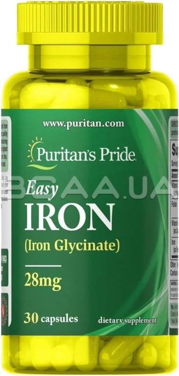 - Puritan's Pride, Easy Iron, Iron Glycinate 28 mg содержит 28 мг бисглицината железа, мягкой, легкоусвояемой формы железа, которая поддерживает выработку эритроцитов, транспортировку кислорода и общий уровень энергии — без распространенных побочных эффектов традиционных добавок железа. Идеально подходит для людей с дефицитом железа или повышенной потребностью в железе, эта формула легка для желудка и подходит для длительного использования.