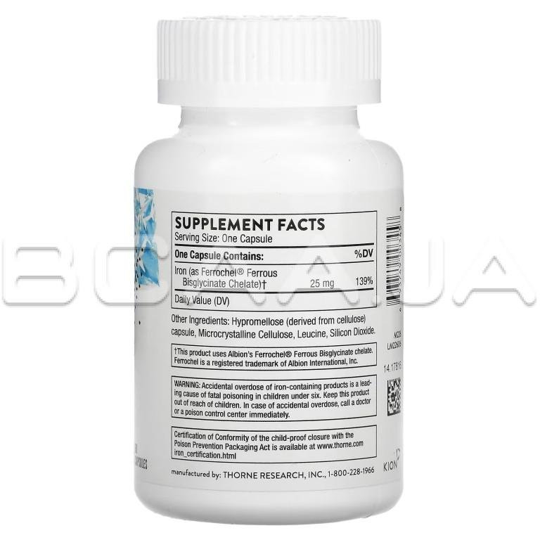- Бисглицинат железа обеспечивает оптимальный способ восполнения железа, которое необходимо для образования эритроцитов. Он помогает бороться с усталостью и другими симптомами дефицита железа у спортсменов и других людей. Традиционные добавки железа, включая такие формы, как сульфат железа, могут вызывать побочные эффекты со стороны желудочно-кишечного тракта, включая тошноту, рвоту, запор, диарею и темный стул, поскольку эти обычные формы железа плохо усваиваются. Биглицинат железа от компании Thorne содержит 25 мг элементарного железа на капсулу, которое прореагировало с глицином для оптимального усвоения в желудочно-кишечном тракте, тем самым помогая уменьшить типичные побочные эффекты со стороны желудочно-кишечного тракта.