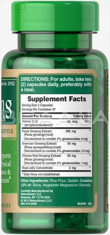 - Комплекс включает концентрат маточного молочка, витамин B-12, а также экстракты красного, американского и китайского женьшеня.