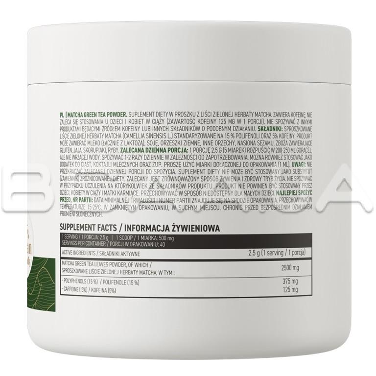 - Ostrovit, Matcha Green Tea Powder — это высококачественная пищевая добавка, содержащая порошкообразные листья зеленого чая Матча, стандартизированные по 15% полифенолов и 5% кофеина. Это препарат с простым составом, без лишних добавок и наполнителей. Это продукт, доступный в виде порошка, который является интересной альтернативой классическому чаю и кофе. Подходит для вегетарианцев и веганов – продукт не содержит ингредиентов животного происхождения.